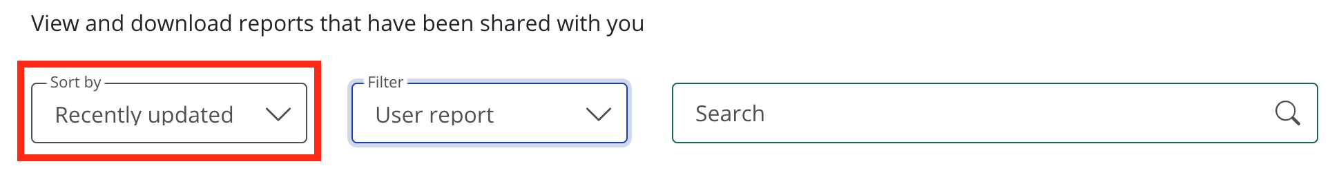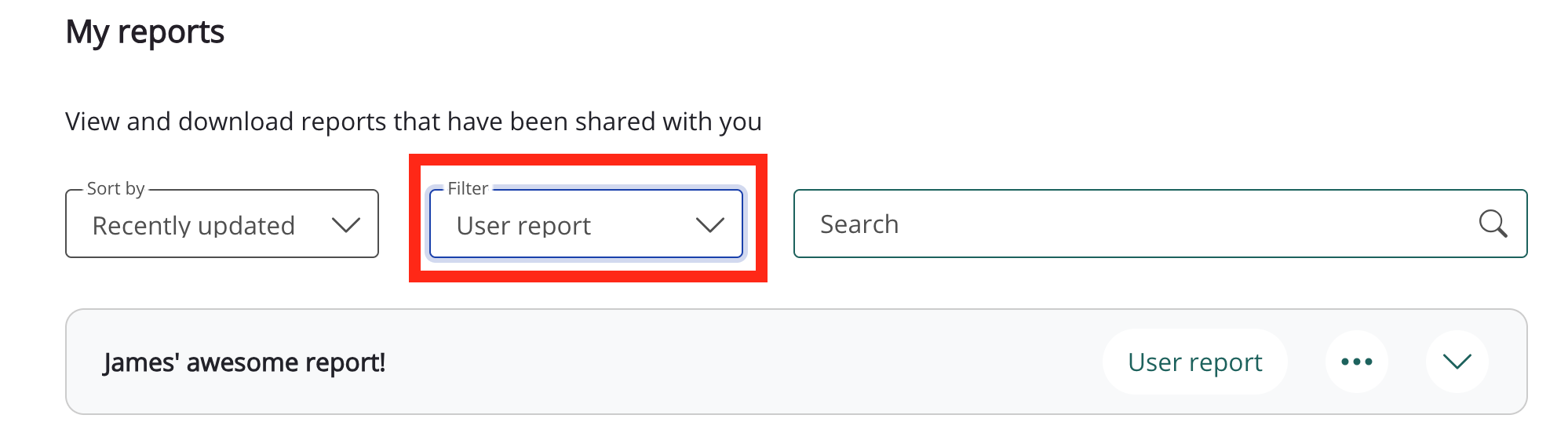 The Filter and Sort by dropdowns can be used in combination with the search bar to further refine the list of reports. For example, you might filter the list to only show User reports, sorted by how recently they were created.