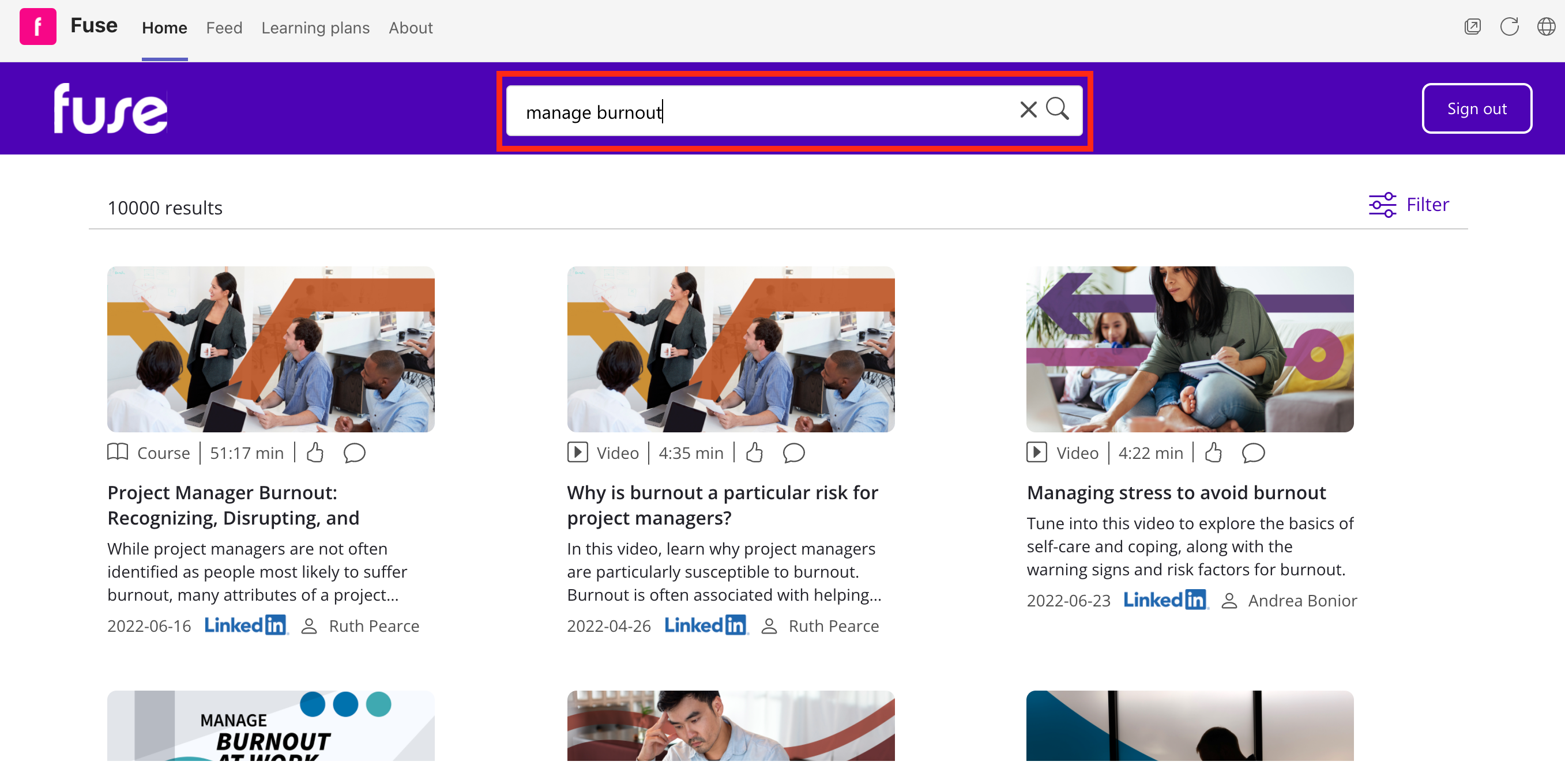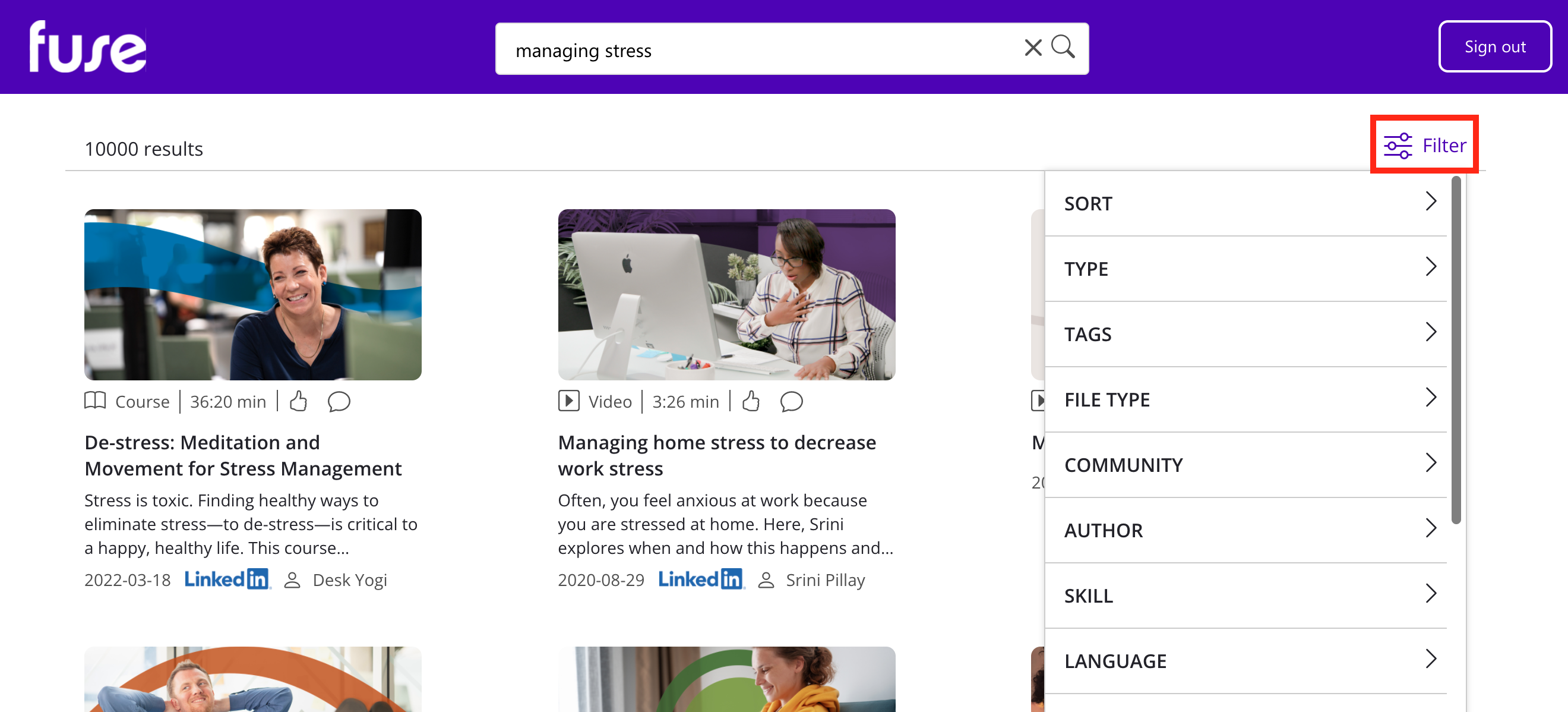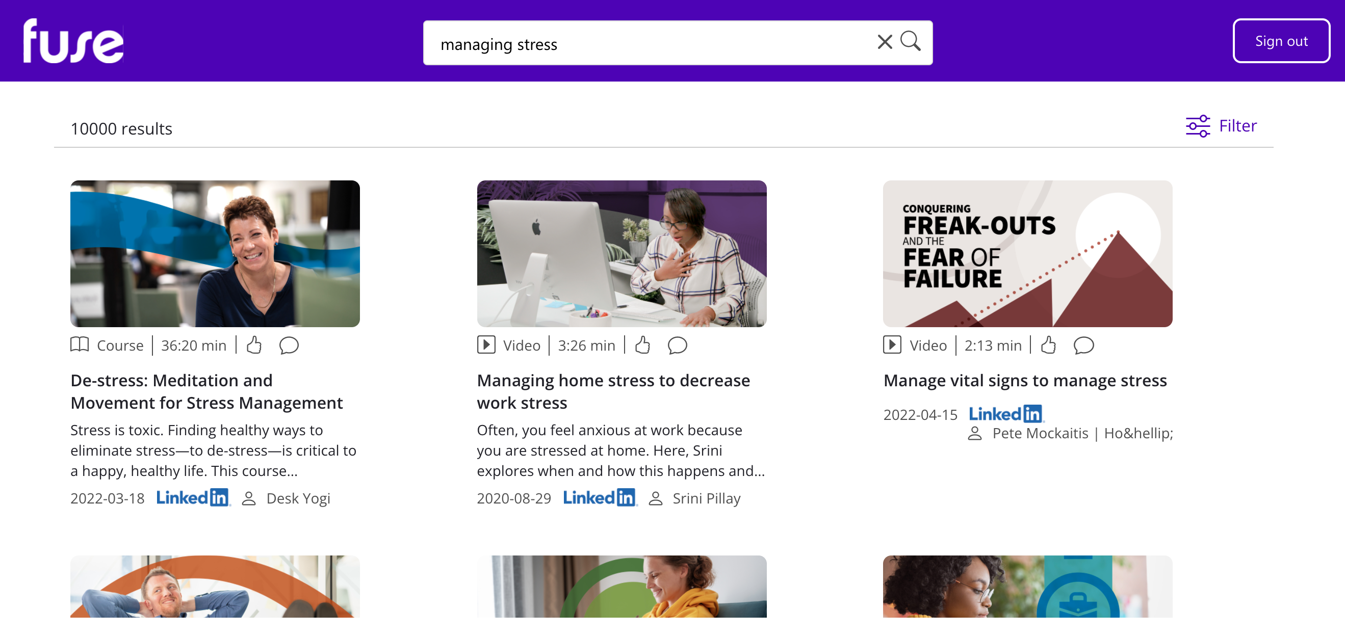 When you have found the item you are looking for, click the result card and the content will open. If the content exists in the Fuse platform, such as an article, file or video in a Fuse community, it opens in Fuse. If the content is from a 3rd party source, such as LinkedIn Learning or Udemy for Business, it will open in that platform.