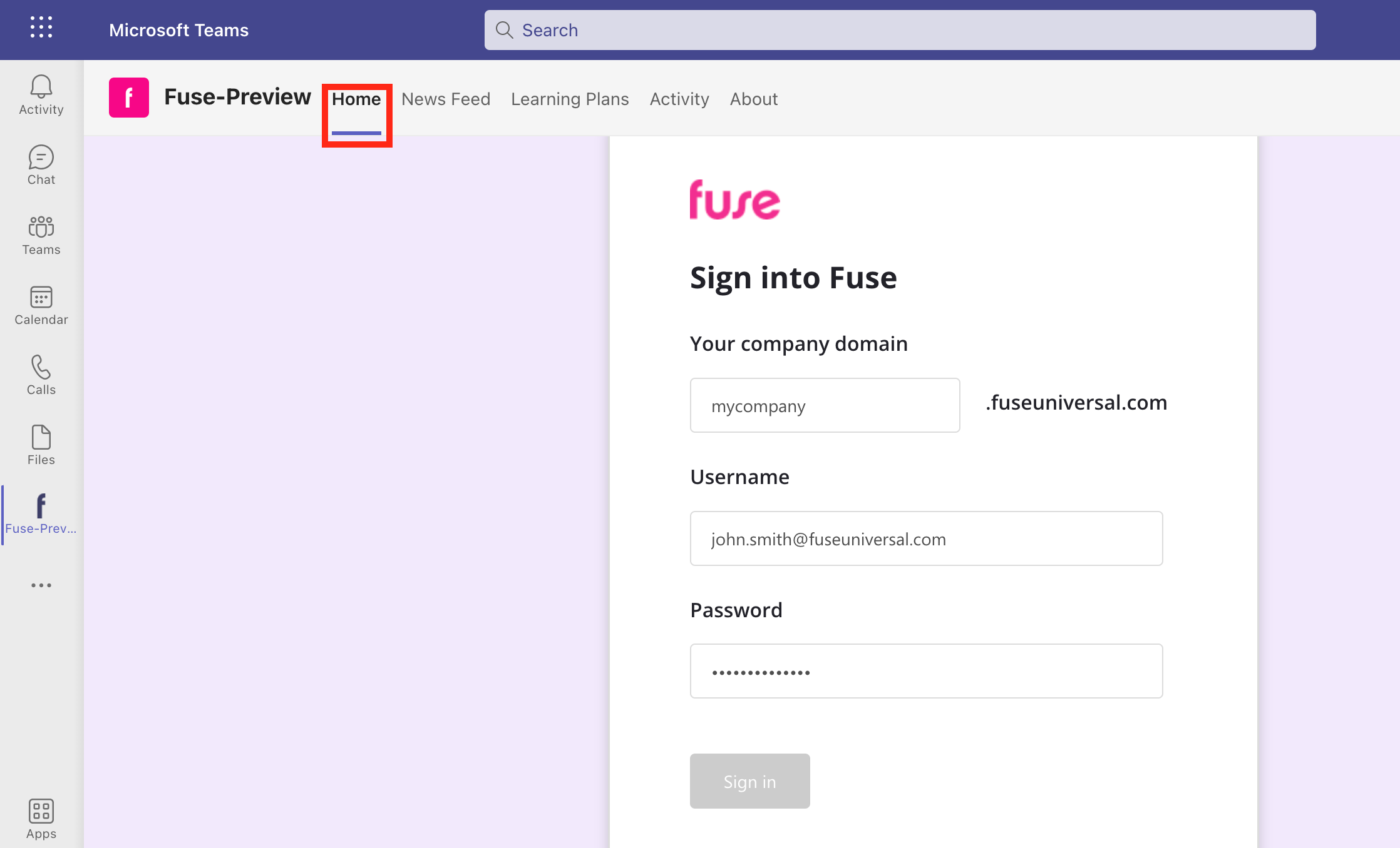The Home tab appears.On the Sign into Fuse screen, enter the following details:
