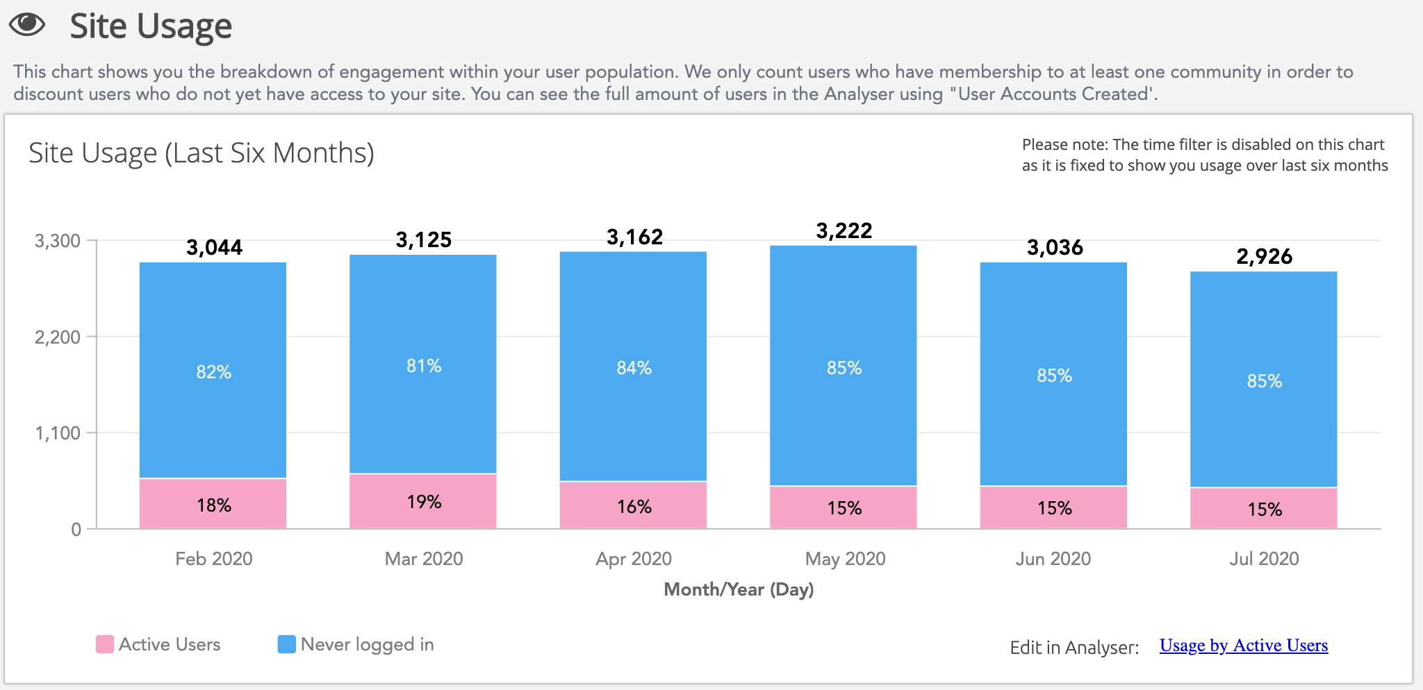 Users must be a member of at least one community to be included in the data on the Site Usage bar chart. Users who do not yet have access to your Fuse instance are not included. You can see the total number of users (Including those without access to the instance) using the User Accounts Created option in the Analyser tool.