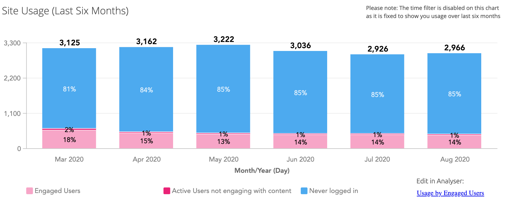 The Site Usage section in the Engaged Users Overview tab, shows a breakdown of user engagement in the Fuse instance over the last 6 months. We only count users who have membership to at least one community, in order to discount users who do not yet have access to your Fuse instance. You can see the total number of users (irrespective of community membership) in the Analyser Tool using the User Accounts Created option.