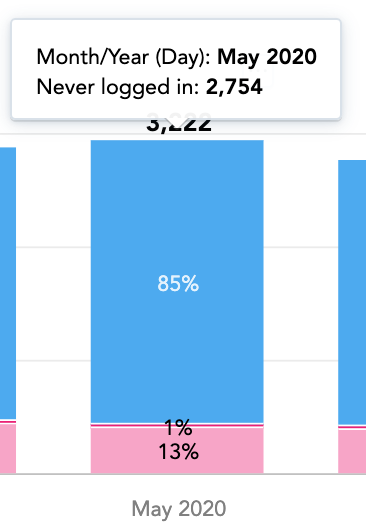 Hovering over the blue portion of the bar for May, reveals 2,754 out of a total of 3,222 users did not log in to Fuse.