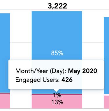 Hovering over the grey portion of the bar for May, reveals 426 users out of a total of 3,222 users engaged with content by sharing, liking, and viewing.