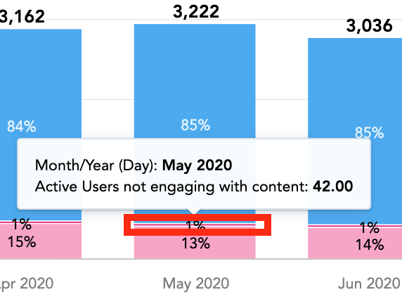 Hovering over the pink portion of the graph reveals that 42 users out of a total of 3,222 users were active, however did not engage with any content by sharing, liking, and viewing.