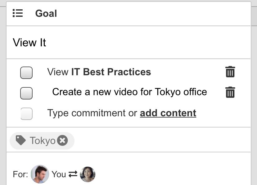 Goals and commitments can be assigned to both the manager and reportee during a one-to-one. For example, some goals or commitments may only be applicable to the manager and some may only be applicable to the reportee.