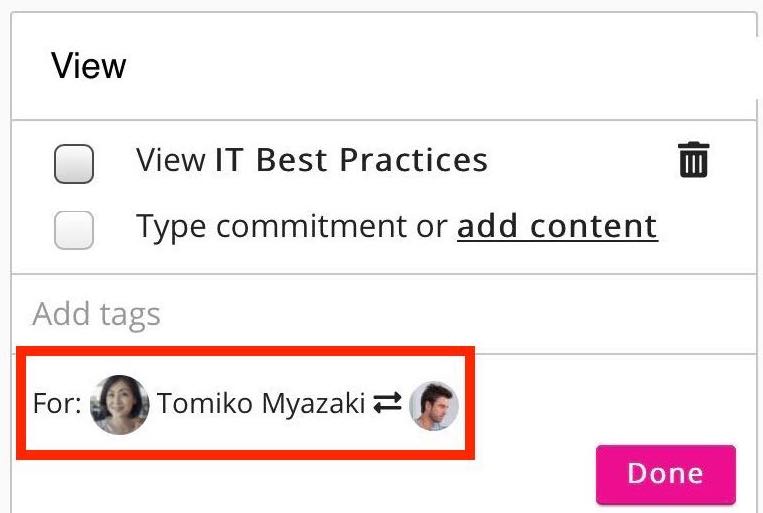 Goals and commitments can be assigned to both the manager and reportee during a one-to-one. For example, some goals or commitments might only be applicable to the manager and some might only be applicable to the reportee. To switch between users:Tap the switch icon at the bottom of a goal.