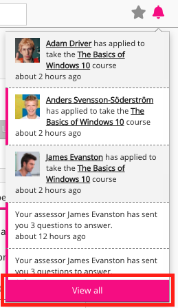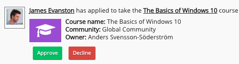If you have been set as an approver, you can approve or decline users who have applied to take a SCORM course. If a user applies to a SCORM course and you are the specified approver, you will receive a notification.