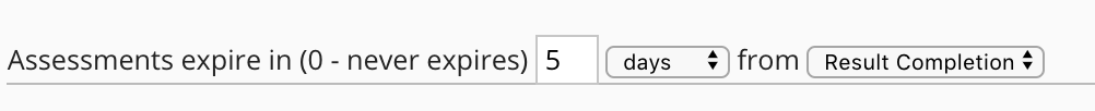 Assessments expire in | How many days or months until the survey expires from when the user clicks "Agree" or from when the user completes the survey. In the example below, the survey will expire 5 days after the user has completed it. |