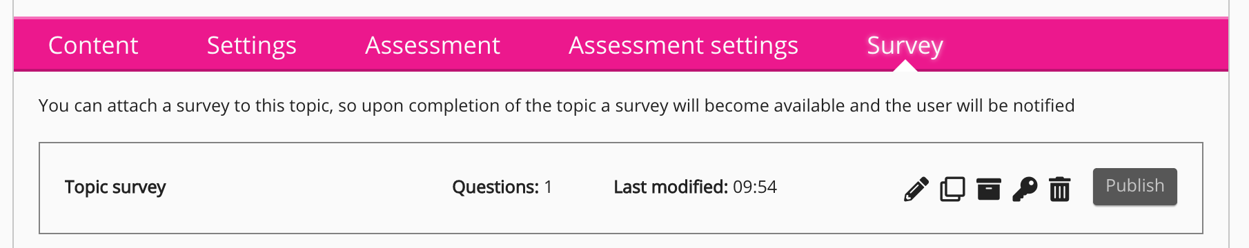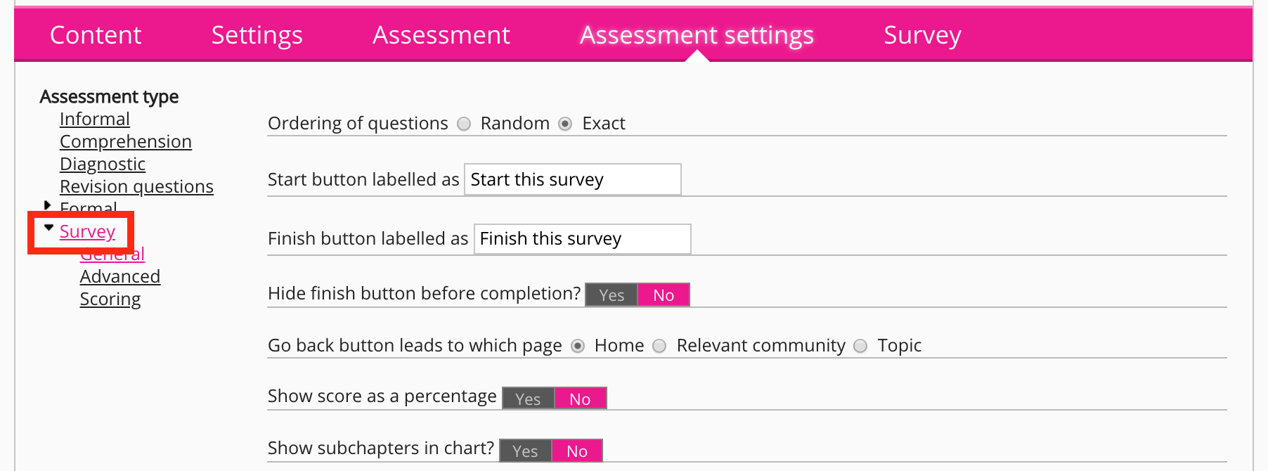The Survey assessment feature is planned for deprecation. It is strongly recommended that you create and attach surveys to topics using the Survey admin feature instead: