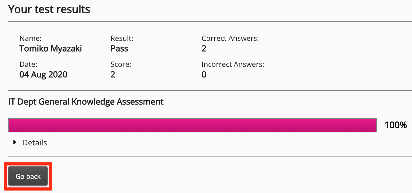 Go back button leads to which page | Select which page the user navigates to when clicking the Go back button. The Go back button is displayed when the user has completed an assessment. ![]() Select one of the following:
