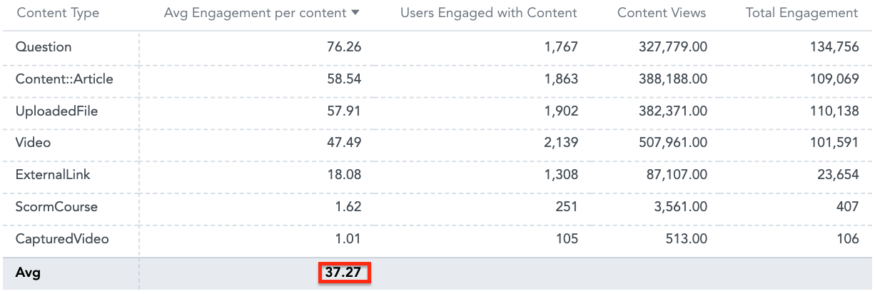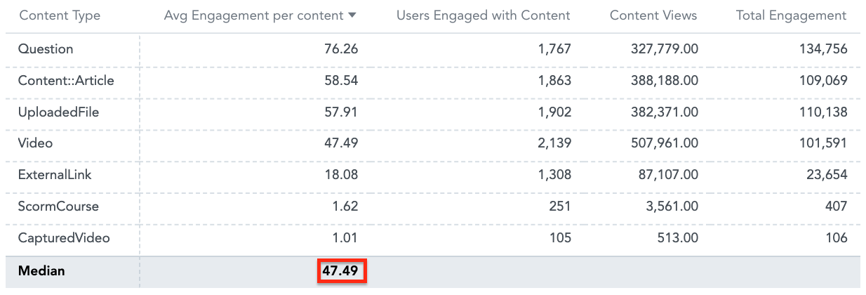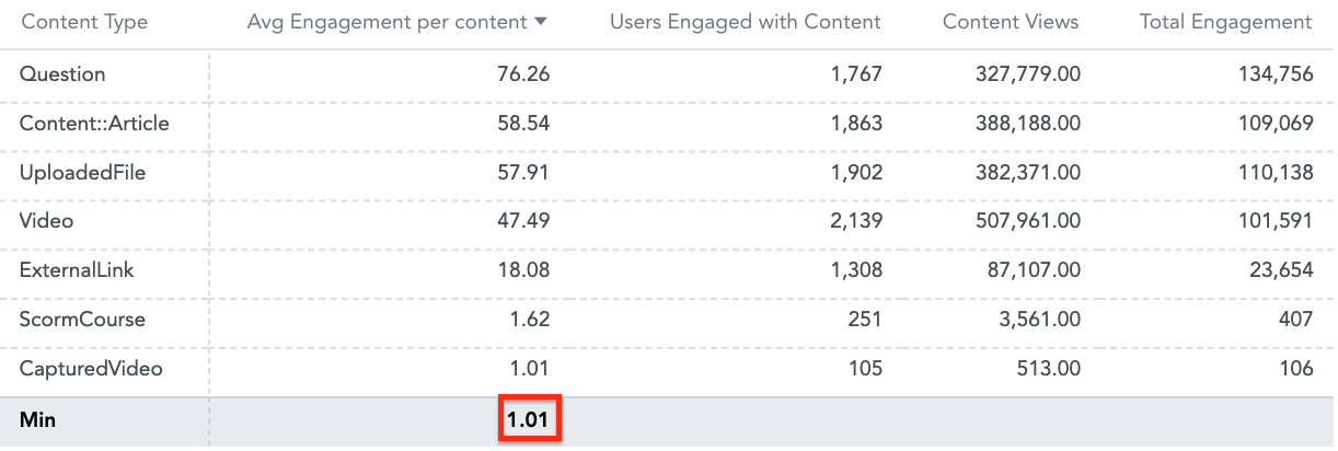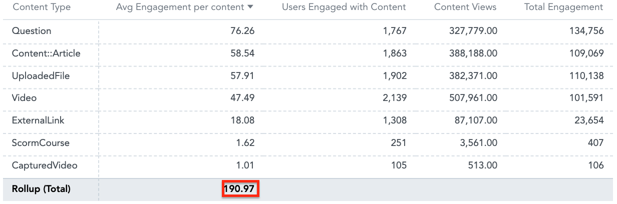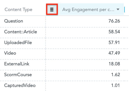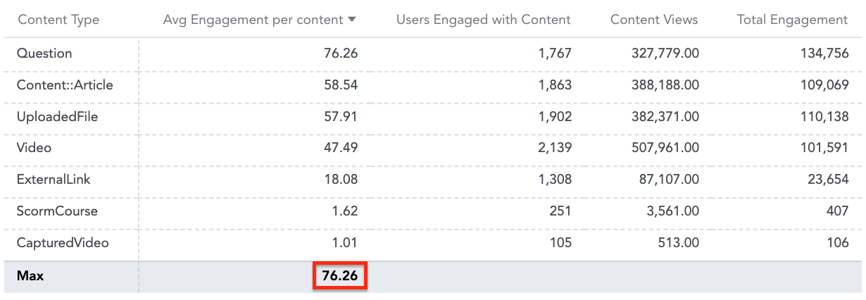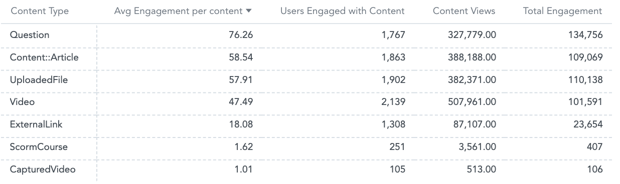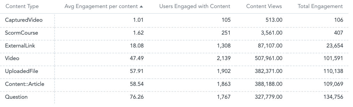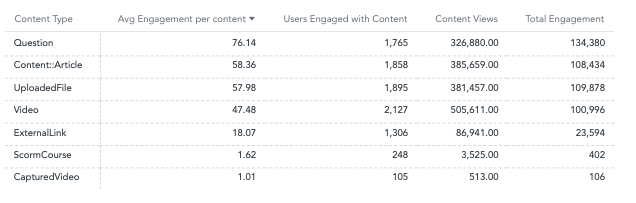 A table can be used to rank data. In the example below, this table lists all the content types in Fuse and ranks them based on their popularity, with the most popular content type at the top of the list and the least popular at the bottom.
