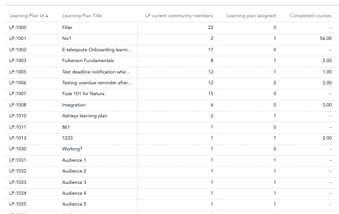 You can use a table to create custom reports. In the example below, this custom report contains a lists all learning plans that exist in Fuse (Including the ID and title of each one), the number of community members assigned to each one, and the total completion.