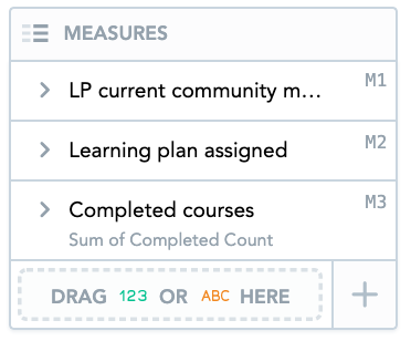 Drag Learning Plan Current Community Members, Learning plan assigned, and Completed Courses from the Data Catalogue, into the Metrics section. You can stack multiple metrics in the Metrics section if you want to display multiple metrics on the table.