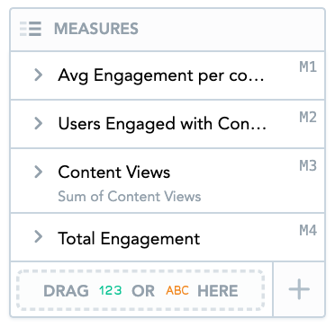Drag the Avg Engagement Per User, Users Engaged with Content, Content Views, and Total Engagement from the Data Catalogue, into the Metrics section.