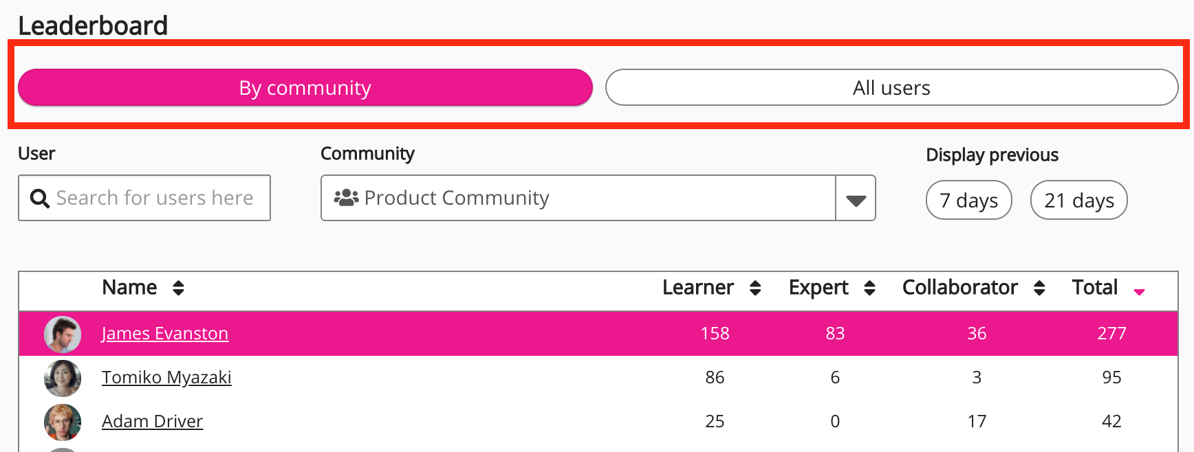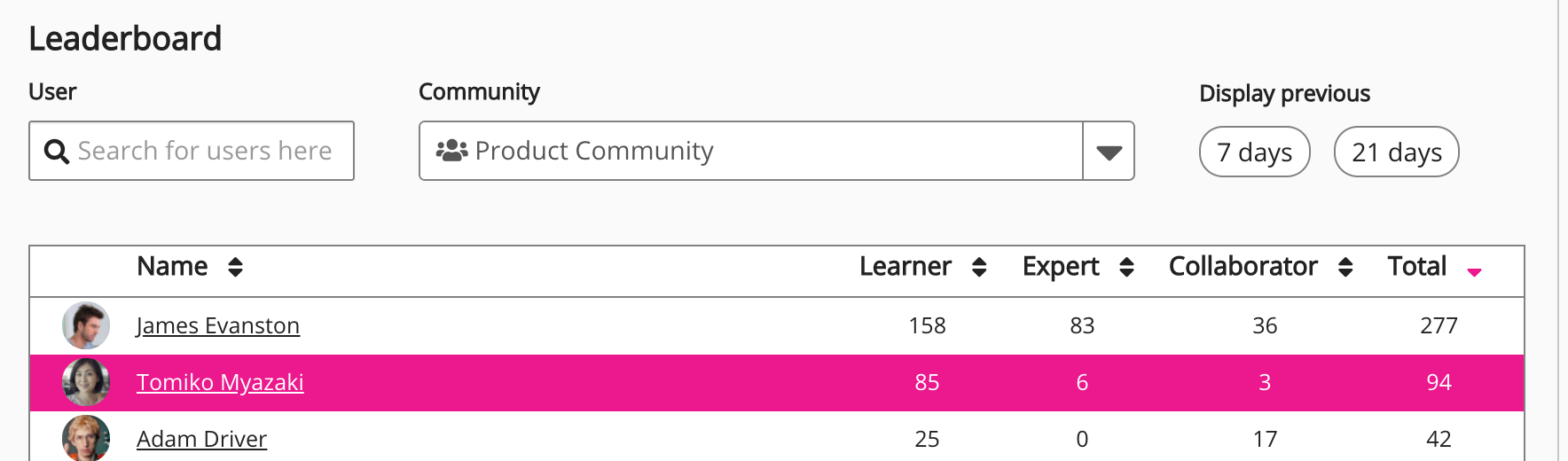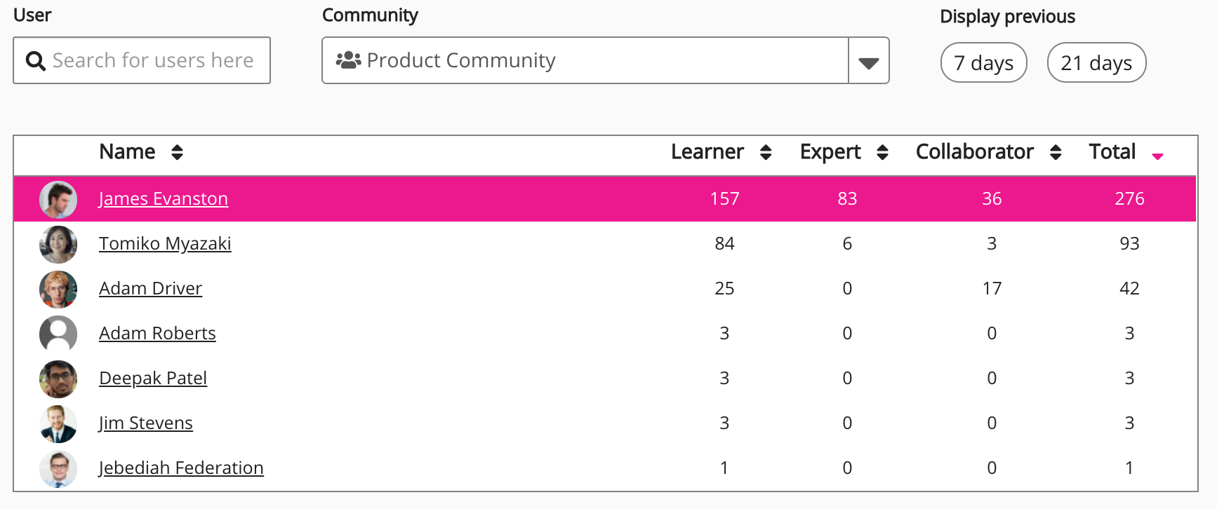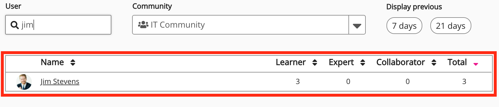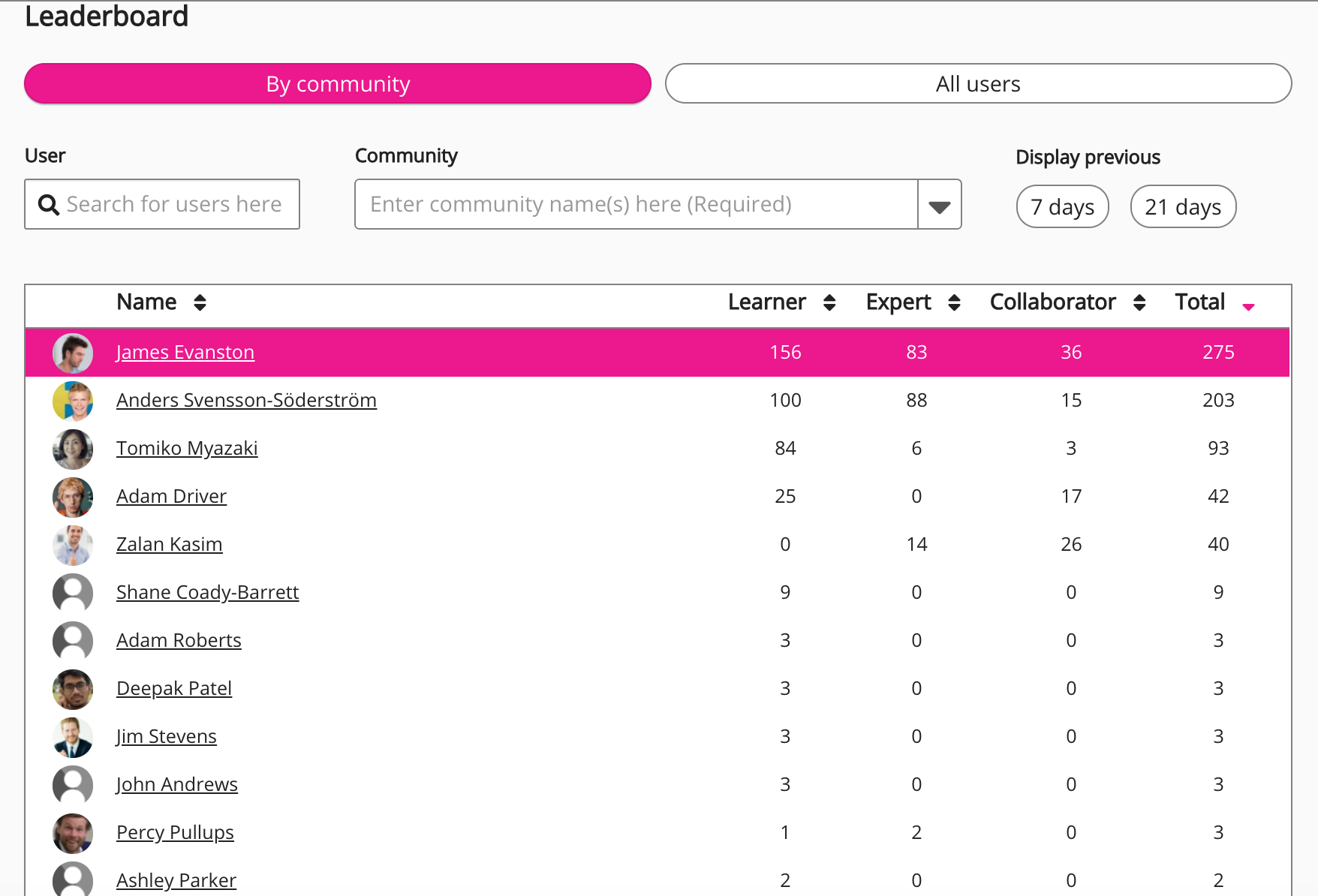 User | Allows you to search for a specific member of the selected community. This is incredibly useful if there is a long list of community members. To search for a community member: The leaderboard narrows down to display a list of matching community members. |