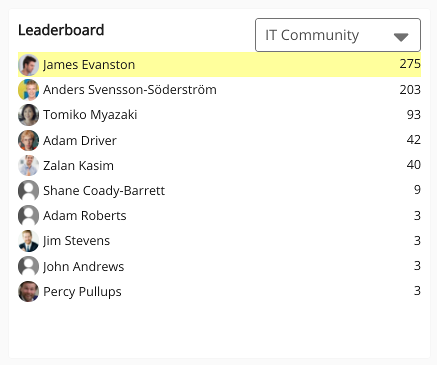 Community | The Community field allows you to filter the leaderboard, so that only users from a specific community are displayed on the leaderboard. Points displayed are generated from across the Fuse instance and are not specific to the selected community. You can only select a community that you are a member/admin of. To filter the list by community: