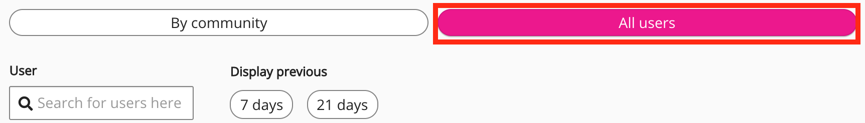 If you are an admin, you will have access to both the By community and All user filter options, as shown below: