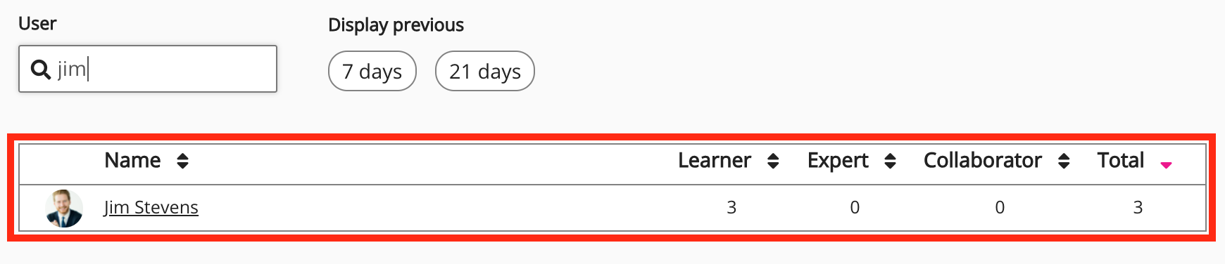 Display previous | Allows you to filter the leaderboard, so that you can see instance-wide rankings for all users in the Fuse instance, from the previous 7 days or 21 days. ![]() |