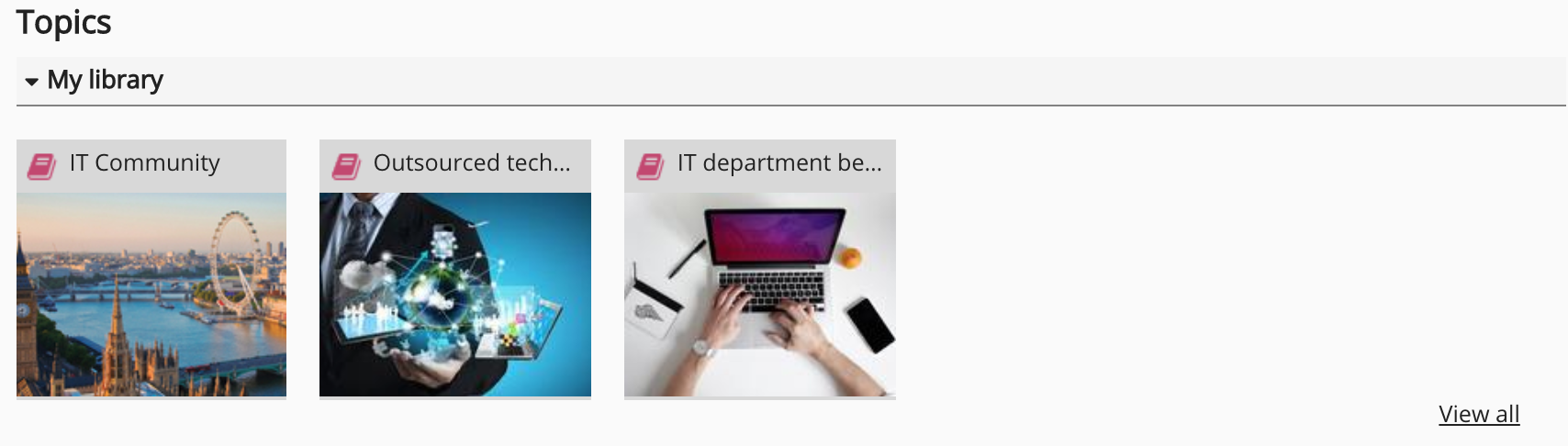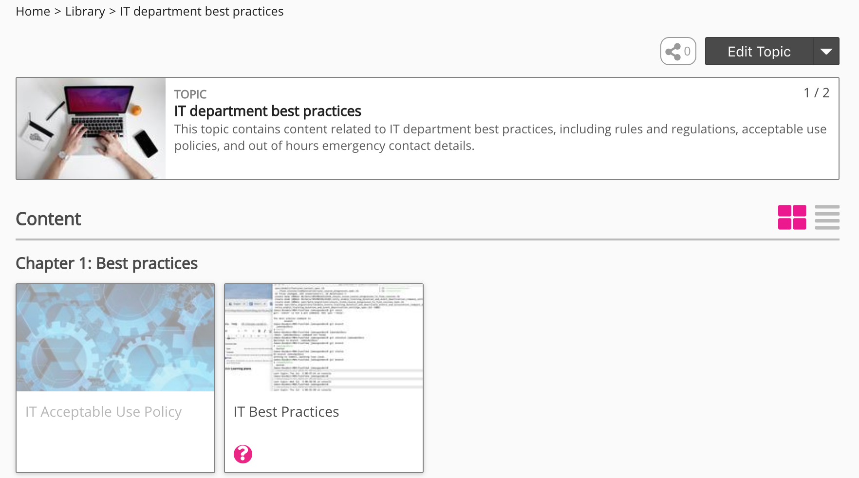 When you click on a topic tile, the topic homepage appears. On the topic homepage, you can view content that exists inside the topic. If you are a community or site admin, you can edit the topic as well as generate reports on user completion.