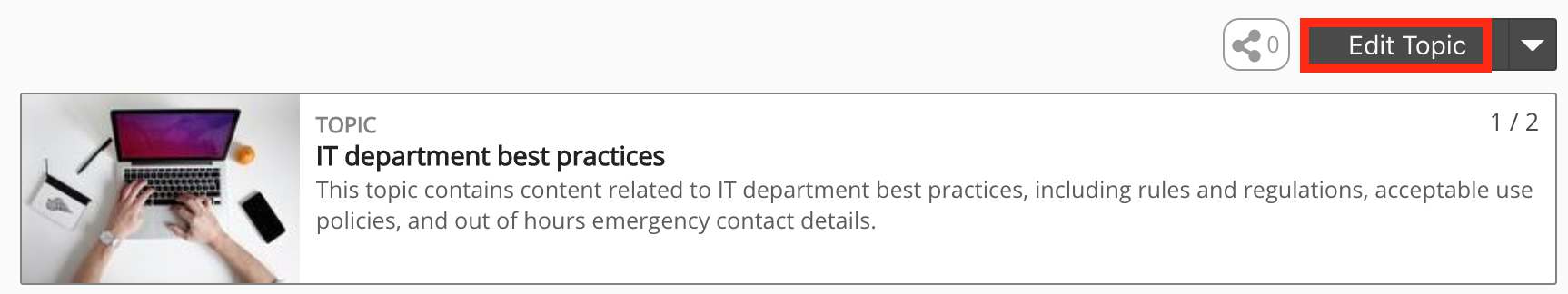 The Edit Topic button is used to access the Edit Topic screen. The Edit Topic screen allows site and community admins to configure topic settings, such as adding and removing content, changing the description, and adding assessments and surveys to the topic.