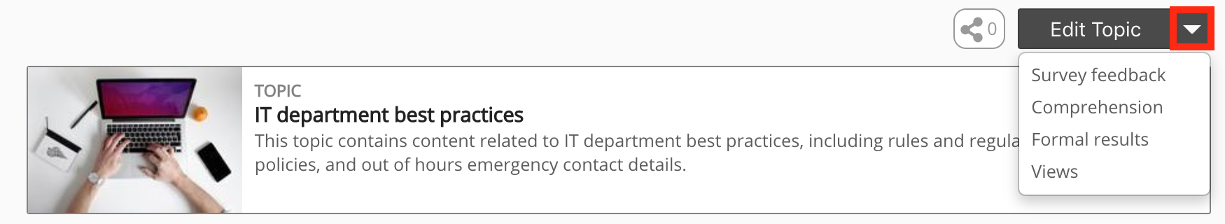 The Edit topic dropdown contains options related to assessments, comprehension, surveys, formal results, and views.