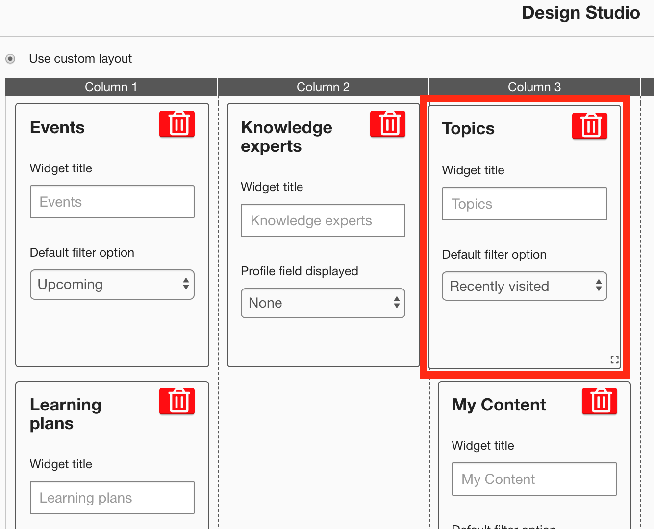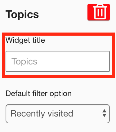The Topics widget appears on the layout grid.[Optional] In the Widget title field, enter a custom title that will be displayed on the widget.