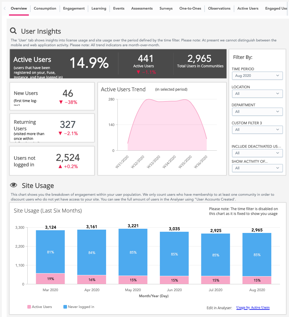 Universal Analytics provides you with detailed data and insights related to different areas of your organisation's Fuse instance, such as user engagement, content consumption, learning plan completion, event attendance, survey response rates, one-to-one goal completion, and observational assessments in the form of filterable charts, graphs, and reports. These charts, graphs, and reports can help you spot upward and downward trends, gaps in user knowledge, and help you plan and devise future learning and content strategies so that your organisation gets the most out of Fuse.