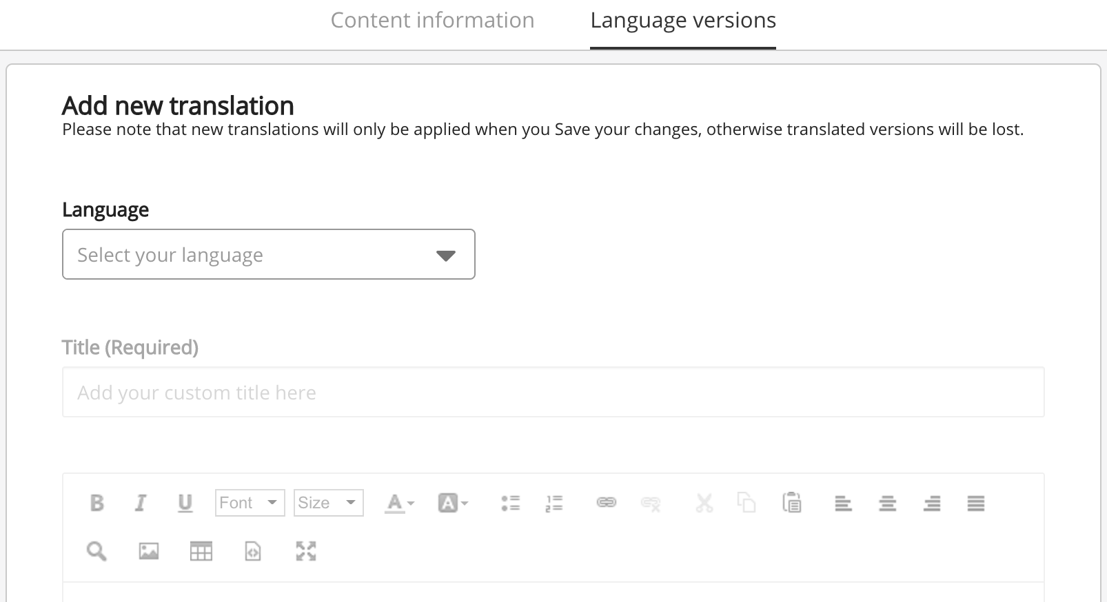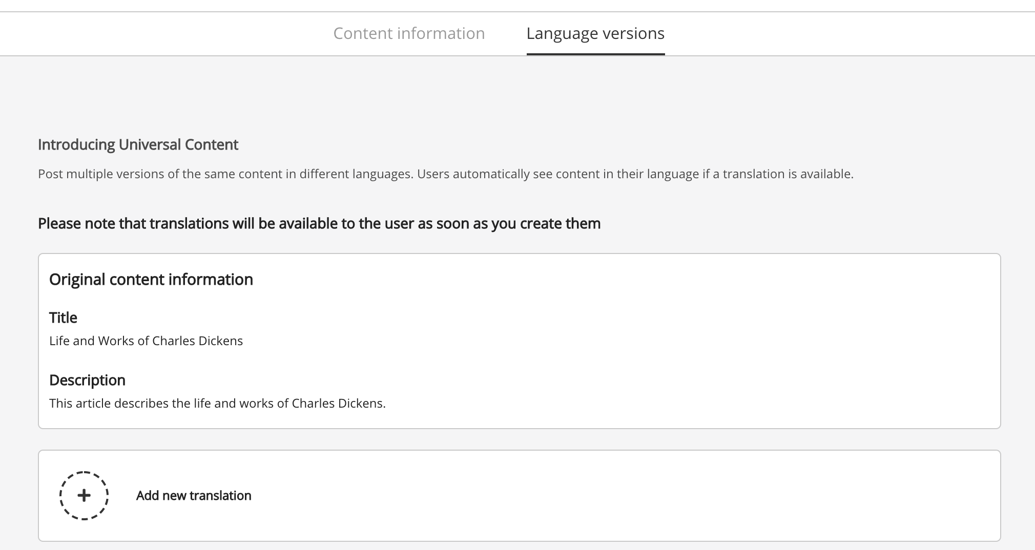 The translation is added to the content in the Language versions section at the bottom of the screen. The translated content will automatically appear when accessed by users with that language selected as their default language. For example, if the user has French selected as their default language in their profile, they will automatically see the French version of the content.