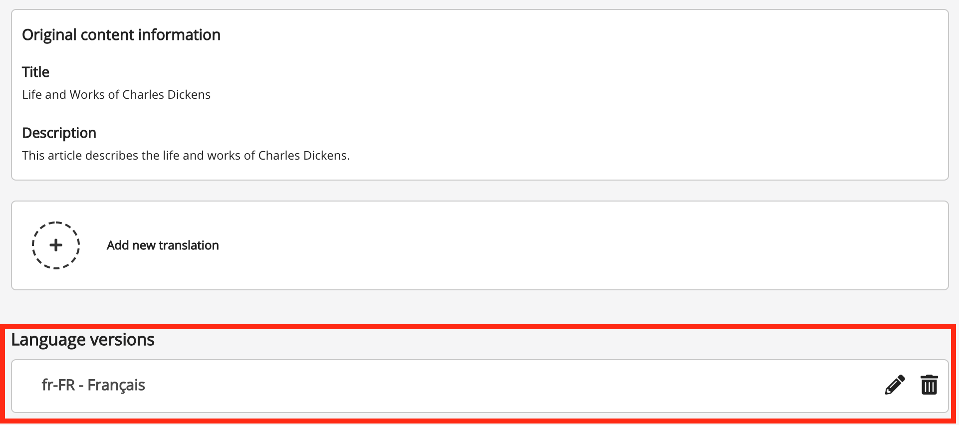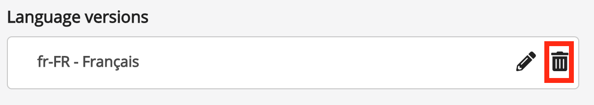 In the Language versions section, click the Delete icon, on the right-hand side of the translation.