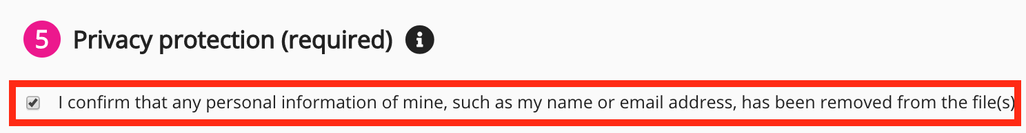 In the Privacy section, select the I confirm that any personal information of mine, such as my name or email address, has been removed from the file(s) checkbox.
