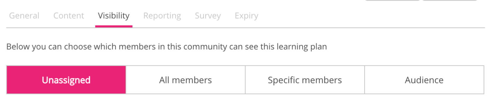 Unassigned | If selected, the learning plan is not visible to any community members or audiences in the community via the My Learning plans page, community pages and in the Learning plans widget, once you have clicked Save. This option is selected by default. Example: You might select this option if: